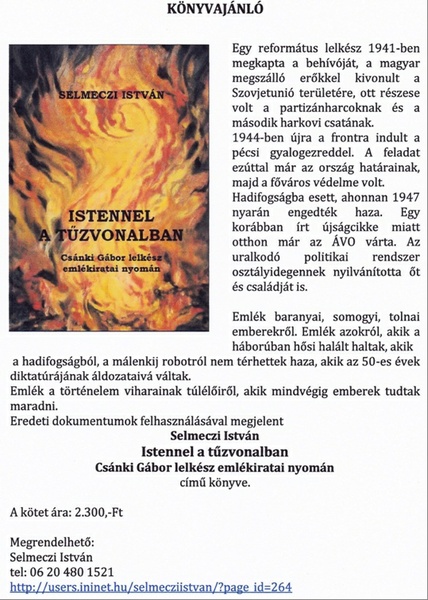 Selmeczi István Istennel a tűzvonalban c. könyvének bemutatójára kerül sor 2015. november 21-én 17.00-kor Dadon, a református gyülekezeti teremben.