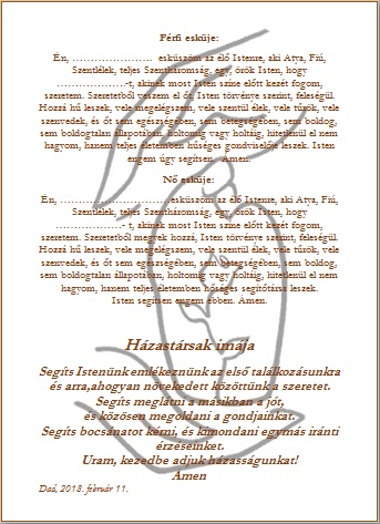 Az istentiszteleten elhangzott igehirdetés szintén megerősített bennünket, házasokat, de fontos tanulságokat rejtett a fiatalok számára is. Jézusnak a sziklára épített ház példázatával érthettük meg, hogy bizony évek alatt kiderül, hogy a „ház"-at érő viharok minden természetesnek tűnő építőkövet kikezdhetnek. A szerelem nem lángol mindig ugyanolyan fénnyel, a többi építőkövet is megtépázhatja az élet. A Krisztusban hívő élet viszont egész más távlatba helyez bennünket, a házasságunkat: átlátunk a vihar „felhőin", bizalmunkat nem vetjük mulandóba. Az így átvészelt vihar pedig mind erősebbé tesz bennünket, gyökereinket Krisztusba fonja.
