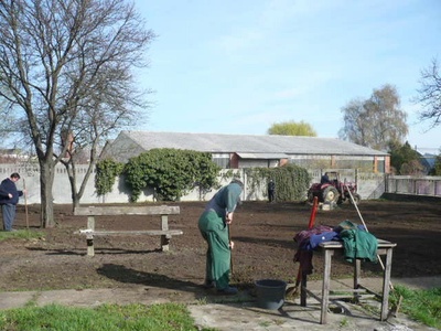 A fűnyírás nehéz feladatot jelentett a munkálat elvégzője számára. A zárt udvar alkalmas szeretetvendégségek megtartására, itt fogadtuk Kisbér város testvértelepülésének, az erdélyi Aranyosgyéresnek néhány tanárát és diákjait. Ezen a helyen szoktuk - természetesen megfelelő időjárás esetén- megtartani a gyerekek játszódélutánját. Nagyon jó közösségformáló alkalom volt, amikor a presbiterek szalonnasütésre jöttek össze az udvaron. A sokrétű munkálatok már tavaly, 2009-ben elkezdődtek. Presbiterek, és a gyülekezet férfi tagjai munkagépekkel, kétkezi munkával is készítgették a talajt a füvesítésre.