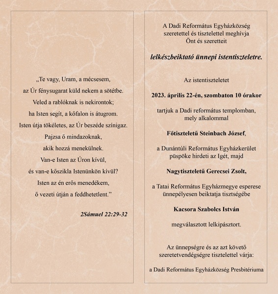 A Dadi Református Egyházközségben ünnepi istentisztelet keretében iktatják be Kacsora Szabolcs István megválasztott lelkipásztort