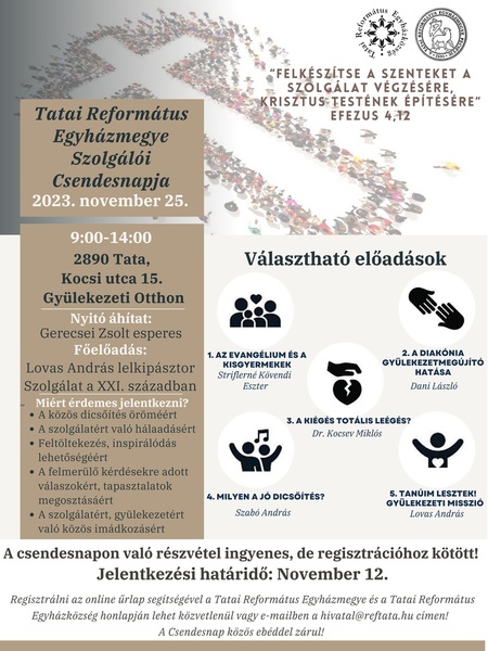 2023. november 25-én a Tatai Ref. Egyházmegyével közösen szeretnék az alkalmat megrendezni, hogy az egyházmegyében lévő szolgálók is kaphassanak segítséget a Krisztus test, az egyház építésében.
