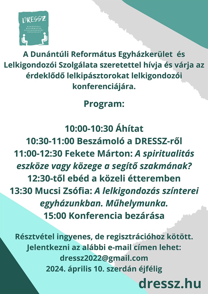 A Dunántúli Református Lelkigondozói Szolgálat (DRESSZ) konferenciát tart Veszprémben április 15-én. A konferencia előadói Mucsi Zsófia a Gyökössy Intézet szakmai igazgatója és Fekete Márton a galyatetői Imádság Házának vezetője lesznek. A részvétel ingyenes, de regisztrációhoz kötött.