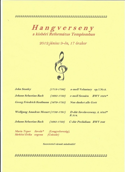 Kisbéren a református templomban Sárközi Erika (orgona) és Maria Teper (fuvola) közreműködésével 2012. június 9-én szombaton 17 órai kezdettel zenés áhítatot szerveznek.