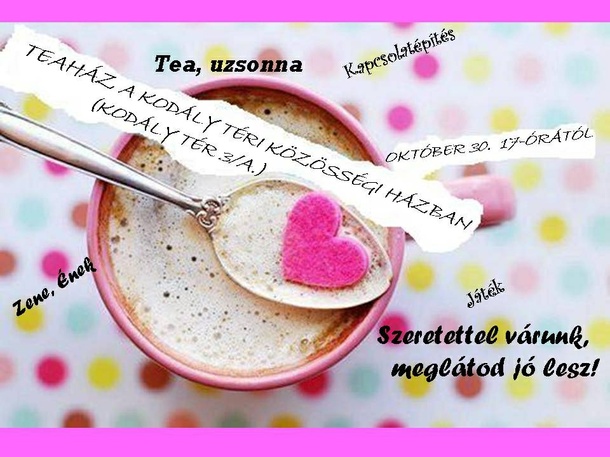 október 30-án kedden 17 órától Tatabánya-Újvárosi Missziói Egyházközség teaházat szervez, melyre szeretettel hívják az érdeklődő fiatalokat, elsősorban a középiskolás korosztályt. A tervezett program a következő: